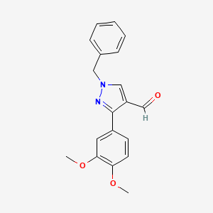 The this compound scaffold combines two pharmacophoric elements: a benzyl group for lipophilicity and membrane permeability, and a 3,4-dimethoxyphenyl moiety known for electron-donating effects that modulate receptor binding. Pyrazole-4-carbaldehydes serve as precursors for Schiff bases, chalcones, and hydrazones—classes of compounds with documented antimicrobial, anticancer, and anti-inflammatory activities. For example, condensation reactions with active methylene compounds yield chalcone derivatives, which exhibit potent inhibition of cyclooxygenase-2 (COX-2) and tyrosine kinases. The aldehyde group’s electrophilicity also enables participation in Friedel-Crafts hydroxyalkylation, expanding access to complex heterocycles.