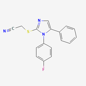 The mechanism of action of 2-((1-(4-fluorophenyl)-5-phenyl-1H-imidazol-2-yl)thio)acetonitrile would depend on its specific application. In medicinal chemistry, it may act by binding to specific molecular targets such as enzymes or receptors, thereby modulating their activity. The imidazole ring is known to interact with various biological targets, making this compound a potential candidate for drug development.