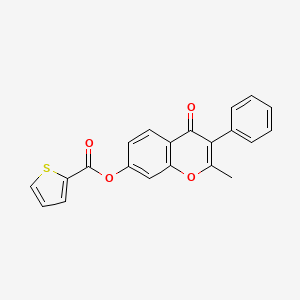 2-methyl-4-oxo-3-phenyl-4H-chromen-7-yl thiophene-2-carboxylate is a synthetic compound classified within the chromene derivatives. These compounds are recognized for their diverse biological activities, including anticancer, anti-inflammatory, and antimicrobial properties. The unique structure of this compound, which includes a chromene core with a thiophene moiety, enhances its potential efficacy in various biological applications.