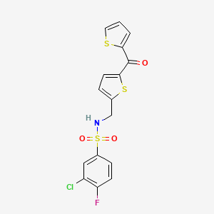 3-Chloro-4-fluoro-N-((5-(thiophene-2-carbonyl)thiophen-2-yl)methyl)benzenesulfonamide is a sulfonamide derivative characterized by a benzenesulfonamide core substituted with chlorine (3-position) and fluorine (4-position). The sulfonamide nitrogen is linked via a methylene bridge to a thiophene ring, which is further functionalized with a thiophene-2-carbonyl group. This structural architecture combines electron-withdrawing substituents (Cl, F) and aromatic heterocycles (thiophene), features common in bioactive molecules targeting enzymes or receptors.