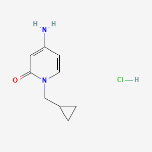 4-Amino-1-(cyclopropylmethyl)pyridin-2-one hydrochloride is a heterocyclic compound featuring a pyridin-2-one core substituted with an amino group at position 4 and a cyclopropylmethyl group at position 1. The hydrochloride salt enhances its solubility and stability, making it suitable for pharmaceutical and biochemical applications. The cyclopropylmethyl group contributes rigidity and moderate lipophilicity, while the pyridin-2-one core offers hydrogen-bonding capabilities due to its ketone and amino functionalities.