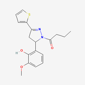 This compound belongs to the pyrazoline class, characterized by a 4,5-dihydro-1H-pyrazole core substituted with a thiophen-2-yl group at position 3 and a 2-hydroxy-3-methoxyphenyl group at position 3. Pyrazolines are widely studied for their pharmacological properties, including antitumor, anti-inflammatory, and antimicrobial activities .