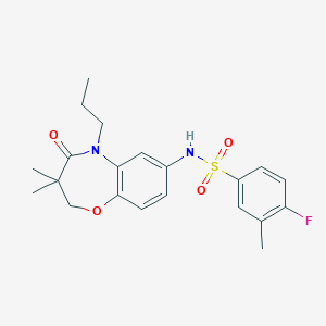 This compound features a benzo[b][1,4]oxazepine core substituted with a 3,3-dimethyl-4-oxo-5-propyl moiety and a 4-fluoro-3-methylbenzenesulfonamide group. The benzo-oxazepine scaffold is a seven-membered heterocyclic ring system combining oxygen and nitrogen atoms, which is structurally distinct from simpler benzodiazepines or chromenones due to its fused bicyclic architecture. Key structural attributes include: