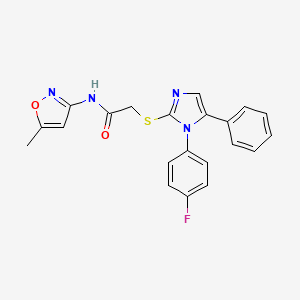 2-((1-(4-Fluorophenyl)-5-phenyl-1H-imidazol-2-yl)thio)-N-(5-methylisoxazol-3-yl)acetamide is a heterocyclic compound featuring an imidazole core substituted with a 4-fluorophenyl group at the 1-position and a phenyl group at the 5-position. A thioether linkage connects the imidazole moiety to an acetamide group, which is further substituted with a 5-methylisoxazole ring.
