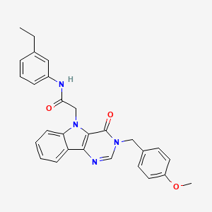 The mechanism of action of N-(3-ethylphenyl)-2-{3-[(4-methoxyphenyl)methyl]-4-oxo-3H,4H,5H-pyrimido[5,4-b]indol-5-yl}acetamide likely involves interaction with specific molecular targets, such as enzymes or receptors. The compound’s structure allows it to bind to these targets, potentially inhibiting their activity or modulating their function. The exact pathways involved would depend on the specific biological context and the nature of the target molecules.
