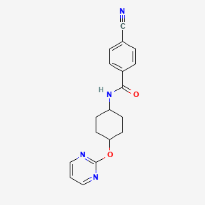 The mechanism of action of 4-cyano-N-((1r,4r)-4-(pyrimidin-2-yloxy)cyclohexyl)benzamide involves its interaction with specific molecular targets, such as enzymes or receptors. The compound may inhibit or activate these targets, leading to downstream effects on cellular signaling pathways. Detailed studies are required to elucidate the precise molecular mechanisms and pathways involved.
