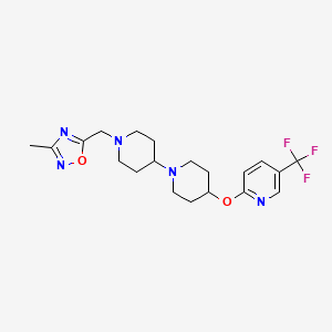 The mechanism of action of 3-Methyl-5-((4-((5-(trifluoromethyl)pyridin-2-yl)oxy)-[1,4’-bipiperidin]-1’-yl)methyl)-1,2,4-oxadiazole involves its interaction with specific molecular targets and pathways. The compound’s trifluoromethyl group and oxadiazole ring play crucial roles in its biological activity. The exact molecular targets and pathways may vary depending on the specific application, but common targets include enzymes and receptors involved in key biological processes .