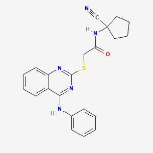 The mechanism of action of 2-(4-anilinoquinazolin-2-yl)sulfanyl-N-(1-cyanocyclopentyl)acetamide involves its interaction with specific molecular targets. For instance, it may inhibit certain enzymes or receptors involved in disease pathways. The quinazoline core is known to interact with kinases, which play a crucial role in cell signaling and cancer progression . Additionally, the compound may induce oxidative stress in bacterial cells, leading to their death .