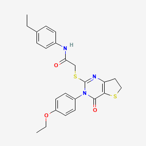 This compound belongs to the thienopyrimidinone-acetamide class, characterized by a thieno[3,2-d]pyrimidin-4-one core substituted with a 4-ethoxyphenyl group at position 3 and a thio-linked N-(4-ethylphenyl)acetamide moiety at position 2. The 4-ethylphenyl group on the acetamide distinguishes it from analogs with methyl, chlorophenyl, or trifluoromethoxy substituents. Such derivatives are synthesized via alkylation of thiopyrimidines with chloroacetamides, a method widely employed for structural diversification .