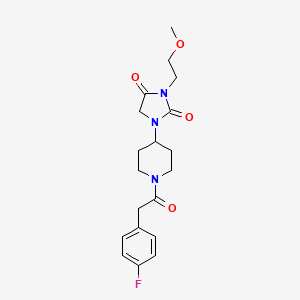 This compound is a piperidine-containing heterocyclic molecule featuring a substituted imidazolidine-2,4-dione core. Its structure includes a 4-fluorophenylacetyl group attached to the piperidine ring at position 1 and a 2-methoxyethyl substituent at position 3 of the imidazolidine-dione moiety. The fluorine atom in the 4-fluorophenyl group enhances metabolic stability and bioavailability, while the methoxyethyl chain may influence solubility and pharmacokinetic properties .