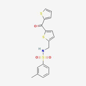 The mechanism by which 3-methyl-N-((5-(thiophene-2-carbonyl)thiophen-2-yl)methyl)benzenesulfonamide exerts its effects involves interactions with specific molecular targets. These targets may include enzymes or receptors that play a role in various biological pathways. The compound’s structure allows it to bind to these targets, potentially modulating their activity and leading to the observed effects.