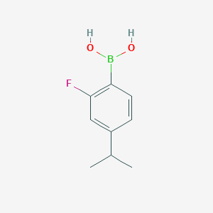 The mechanism of action of (2-Fluoro-4-isopropylphenyl)boronic acid in Suzuki-Miyaura coupling involves the transmetalation of the boronic acid with a palladium catalyst, followed by reductive elimination to form the desired carbon-carbon bond . The boronic acid group acts as a nucleophile, transferring the aryl group to the palladium center. This process is facilitated by the presence of base and the unique electronic properties of the fluoro and isopropyl substituents .