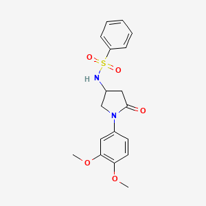 N-[1-(3,4-Dimethoxyphenyl)-5-oxopyrrolidin-3-yl]benzenesulfonamide is a synthetic organic compound characterized by a pyrrolidinone core substituted with a 3,4-dimethoxyphenyl group at the 1-position and a benzenesulfonamide moiety at the 3-position. The pyrrolidinone (5-membered lactam) contributes to conformational rigidity, while the 3,4-dimethoxyphenyl group introduces electron-donating substituents that may influence electronic properties and binding interactions. The benzenesulfonamide group is a common pharmacophore in medicinal chemistry, often associated with enzyme inhibition (e.g., carbonic anhydrase, cyclooxygenase) due to its ability to participate in hydrogen bonding and coordinate metal ions .
