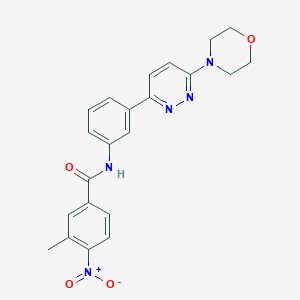 The compound comprises a morpholinopyridazinyl group attached to a phenyl ring, a nitrobenzamide moiety, and a methyl substituent at the 3-position. The morpholine ring enhances solubility and hydrogen-bonding capacity, while the nitro group increases electrophilicity, making the compound reactive toward nucleophilic substitution or reduction. The methyl group may sterically hinder certain reactions, affecting regioselectivity .