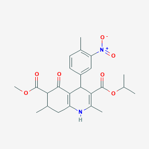 This compound belongs to the hexahydroquinoline dicarboxylate family, characterized by a bicyclic framework with ester substituents at positions 3 and 4. The 4-(4-methyl-3-nitrophenyl) group introduces steric bulk and electron-withdrawing properties, while the methyl and propan-2-yl ester moieties influence lipophilicity and metabolic stability.