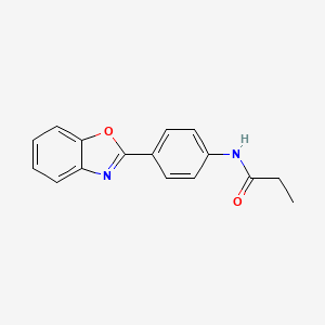 The synthesis of N-[4-(1,3-benzoxazol-2-yl)phenyl]propanamide typically involves the reaction of 2-aminophenol with an appropriate aldehyde or ketone to form the benzoxazole ringOne common method involves the use of 2-aminophenol and an aldehyde in the presence of a catalyst such as phosphorous trichloride (PCl3) in chlorobenzene at elevated temperatures (130-135°C) .
