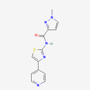 The mechanism of action of 1-methyl-N-(4-(pyridin-4-yl)thiazol-2-yl)-1H-pyrazole-3-carboxamide involves its interaction with specific molecular targets. These targets may include enzymes, receptors, or other proteins involved in key biological pathways. The compound’s structure allows it to bind to these targets, modulating their activity and leading to various biological effects.