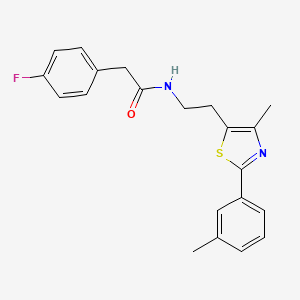 This compound is a thiazole-containing acetamide derivative characterized by a 4-fluorophenyl group attached to the acetamide backbone and a 4-methyl-2-(m-tolyl)thiazole moiety linked via an ethyl chain. The thiazole ring, a five-membered heterocycle with sulfur and nitrogen atoms, is substituted at position 2 with an m-tolyl (3-methylphenyl) group and at position 5 with a methyl group.