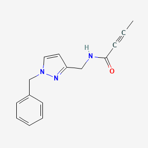 N-[(1-Benzylpyrazol-3-yl)methyl]but-2-ynamide is a compound that belongs to the class of pyrazoles, which are known for their versatile applications in organic synthesis and medicinal chemistry. This compound is characterized by its unique structure, which includes a benzyl group attached to a pyrazole ring and a but-2-ynamide moiety. The molecular formula of this compound is C15H15N3O, and it has a molecular weight of 253.305 g/mol.