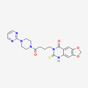 The synthesis of 7-{4-oxo-4-[4-(pyrimidin-2-yl)piperazin-1-yl]butyl}-6-sulfanylidene-2H,5H,6H,7H,8H-[1,3]dioxolo[4,5-g]quinazolin-8-one typically involves multiple steps, starting from readily available starting materials. The key steps include the formation of the quinazolinone core, the introduction of the dioxolo ring, and the attachment of the pyrimidinylpiperazine moiety. Specific reaction conditions, such as temperature, solvents, and catalysts, are optimized to achieve high yields and purity.