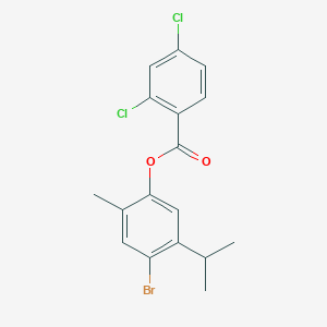 The mechanism of action of 4-Bromo-5-isopropyl-2-methylphenyl 2,4-dichlorobenzenecarboxylate involves its interaction with specific molecular targets. The bromine and chlorine atoms in the compound can form halogen bonds with target molecules, influencing their activity. The isopropyl and methyl groups can also affect the compound’s hydrophobicity and binding affinity, modulating its overall biological activity.