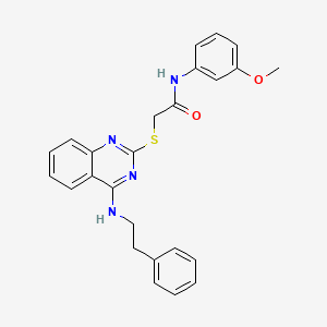 N-(3-methoxyphenyl)-2-({4-[(2-phenylethyl)amino]quinazolin-2-yl}sulfanyl)acetamide is a synthetic small molecule with the molecular formula C₂₅H₂₇N₅O₂S and a molecular weight of 461.59 g/mol. Its IUPAC name reflects a quinazoline core substituted with a phenylethylamino group at position 4 and a sulfanyl-acetamide moiety at position 2. The acetamide side chain is further functionalized with a 3-methoxyphenyl group (). This compound is available for research purposes, typically in milligram quantities, and is part of a broader class of quinazoline derivatives investigated for diverse biological activities, including kinase inhibition and anti-inflammatory effects ().