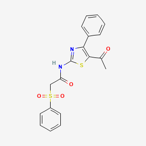 N-(5-acetyl-4-phenyl-1,3-thiazol-2-yl)-2-(benzenesulfonyl)acetamide is a synthetic organic compound that belongs to the class of thiazole derivatives Thiazoles are heterocyclic compounds containing both sulfur and nitrogen atoms in a five-membered ring This particular compound is characterized by the presence of an acetyl group, a phenyl group, and a benzenesulfonyl group attached to the thiazole ring