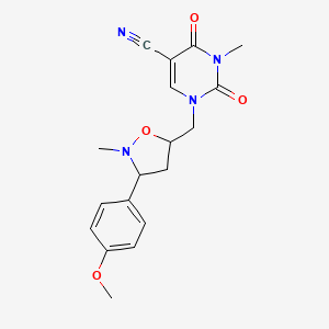 The compound 1-{[3-(4-Methoxyphenyl)-2-methyltetrahydro-5-isoxazolyl]methyl}-3-methyl-2,4-dioxo-1,2,3,4-tetrahydro-5-pyrimidinecarbonitrile (hereafter referred to as Compound A ) is a complex organic molecule with potential biological activity. Its structure suggests it may interact with various biological targets, making it a candidate for pharmacological studies.