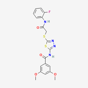 This compound is a 1,3,4-thiadiazole derivative characterized by a 2-fluorophenylamino-oxoethylthio substituent at position 5 and a 3,5-dimethoxybenzamide group at position 2 of the thiadiazole ring. The 1,3,4-thiadiazole core is a nitrogen-sulfur heterocycle known for its planar structure and diverse bioactivity, including antimicrobial, anticancer, and enzyme inhibitory properties .