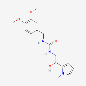 This compound is a urea derivative characterized by a 3,4-dimethoxybenzyl group attached to one nitrogen atom and a 2-hydroxy-2-(1-methyl-1H-pyrrol-2-yl)ethyl substituent on the adjacent urea nitrogen. The structural complexity arises from the combination of aromatic methoxy groups, a pyrrole ring, and a hydroxyl moiety.