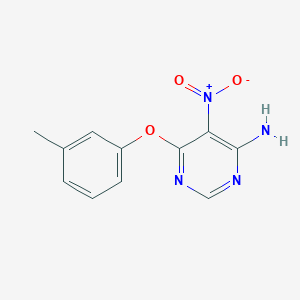 5-Nitro-6-(m-tolyloxy)pyrimidin-4-amine is a pyrimidine derivative characterized by a nitro group at the 5-position, a meta-tolyloxy group (3-methylphenoxy) at the 6-position, and an amine at the 4-position. Pyrimidine derivatives are widely explored in medicinal chemistry due to their versatility in hydrogen bonding and aromatic interactions, which are critical for biological activity . The meta-tolyloxy group distinguishes it from the para-isomer (5-Nitro-6-(p-tolyloxy)pyrimidin-4-amine), which was discontinued, likely due to differences in steric or electronic properties affecting efficacy or stability .