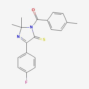 The synthesis of 4-(4-fluorophenyl)-2,2-dimethyl-1-(4-methylbenzoyl)-2,5-dihydro-1H-imidazole-5-thione typically involves multi-step organic reactions. One common method includes the reaction of 4-fluoroaniline with acetone to form an intermediate, which is then reacted with 4-methylbenzoyl chloride in the presence of a base to yield the final product. The reaction conditions often require controlled temperatures and the use of solvents such as dichloromethane or ethanol to facilitate the reactions.