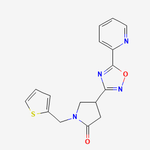 The synthesis of 4-(5-(Pyridin-2-yl)-1,2,4-oxadiazol-3-yl)-1-(thiophen-2-ylmethyl)pyrrolidin-2-one typically involves multi-step organic reactions. One common synthetic route starts with the preparation of the pyridine and thiophene intermediates, followed by the formation of the oxadiazole ring through cyclization reactions. The final step involves the coupling of these intermediates under specific conditions, such as the use of catalysts and controlled temperatures, to form the desired compound.