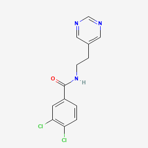 The compound features a benzamide core with dichloro substitutions and a pyrimidin-5-yl ethyl group. The synthesis typically involves the reaction of 3,4-dichlorobenzoyl chloride with 2-(pyrimidin-5-yl)ethylamine, often in the presence of a base such as triethylamine in an organic solvent like dichloromethane. The product is purified through recrystallization or column chromatography.