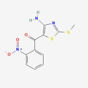 The mechanism of action of (4-Amino-2-(methylthio)thiazol-5-yl)(2-nitrophenyl)methanone involves its interaction with various molecular targets. The thiazole ring can interact with enzymes and receptors, potentially inhibiting their activity. The nitrophenyl group can participate in electron transfer reactions, affecting cellular processes. The compound’s overall effect is determined by its ability to modulate specific biochemical pathways.