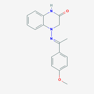 (E)-4-((1-(4-Methoxyphenyl)ethylidene)amino)-3,4-dihydroquinoxalin-2(1H)-one is a quinoxalinone derivative characterized by a 3,4-dihydroquinoxalin-2(1H)-one core substituted at the 4-position with an (E)-configured ethylideneamino group bearing a 4-methoxyphenyl moiety. The compound’s synthesis likely involves condensation of o-phenylenediamine with glyoxalate derivatives, followed by functionalization via reductive amination or palladium-catalyzed cross-coupling reactions, as seen in related quinoxalinones .