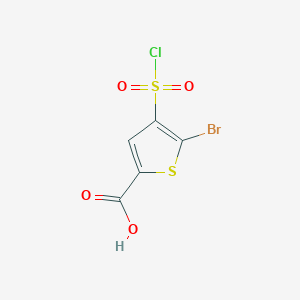 The mechanism of action of 5-Bromo-4-(chlorosulfonyl)thiophene-2-carboxylic acid depends on its specific application. In chemical reactions, the bromine and chlorine atoms act as reactive sites for substitution and coupling reactions. The sulfonyl group can participate in various chemical transformations, influencing the reactivity and stability of the compound. In biological systems, the compound may interact with specific molecular targets, such as enzymes or receptors, through its functional groups, leading to desired biological effects.