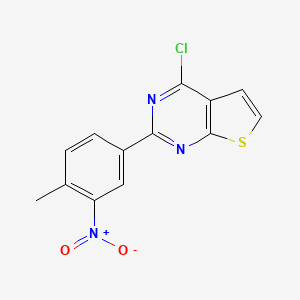 The synthesis of 4-Chloro-2-(4-methyl-3-nitrophenyl)thieno[2,3-d]pyrimidine typically involves multiple steps, including cyclization, chlorination, and nucleophilic substitution . One common synthetic route starts with the preparation of methyl 3-aminothiophene-2-carboxylate, which undergoes cyclization with urea to form the thieno[2,3-d]pyrimidine core . This intermediate is then chlorinated to introduce the chloro substituent at the 4-position. Finally, a nucleophilic substitution reaction with 4-methyl-3-nitrophenyl chloride yields the target compound .