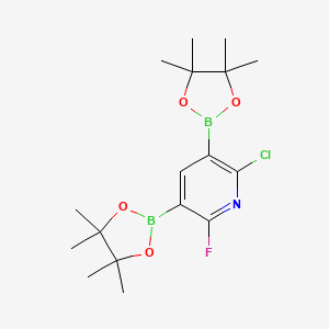 The synthesis of 2-Chloro-6-fluoropyridine-3,5-diboronic acid, pinacol ester typically involves the reaction of 2-chloro-6-fluoropyridine with bis(pinacolato)diboron in the presence of a palladium catalyst. The reaction is carried out under an inert atmosphere, usually nitrogen or argon, to prevent oxidation. The reaction conditions often include the use of a base such as potassium carbonate and a solvent like tetrahydrofuran (THF) or dimethylformamide (DMF). The reaction mixture is heated to a temperature range of 80-100°C for several hours to ensure complete conversion .