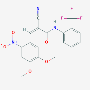 This compound is a synthetic enamide derivative characterized by a (Z)-configured α,β-unsaturated cyano group, a 4,5-dimethoxy-2-nitrophenyl moiety, and a 2-(trifluoromethyl)phenyl substituent. Its structural complexity confers unique electronic and steric properties, making it a candidate for modulating biological targets such as G protein-coupled receptors (GPCRs) or nuclear receptors. The nitro and trifluoromethyl groups enhance electrophilicity and metabolic stability, while the dimethoxy substituents may improve solubility and binding affinity .
