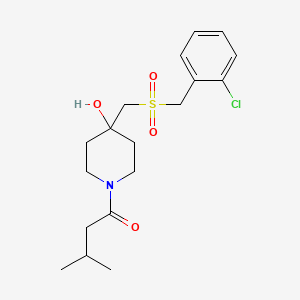 1-(4-{[(2-Chlorobenzyl)sulfonyl]methyl}-4-hydroxypiperidino)-3-methyl-1-butanone, with the CAS number 865659-33-2, is a complex organic compound notable for its unique structural features, which include a piperidine ring and a sulfonyl group. Its molecular formula is C18H26ClNO4S, and it has a molar mass of 387.92 g/mol. The presence of functional groups such as the hydroxypiperidine and sulfonyl groups is significant for its biological activity and potential therapeutic applications.