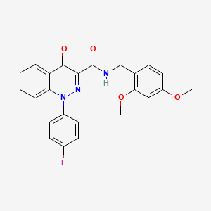 N-[(2,4-Dimethoxyphenyl)methyl]-1-(4-fluorophenyl)-4-oxo-1,4-dihydrocinnoline-3-carboxamide is a cinnoline-3-carboxamide derivative characterized by a 1,4-dihydrocinnoline core substituted with a 4-fluorophenyl group at position 1 and a 2,4-dimethoxybenzyl carboxamide moiety at position 2. While its specific therapeutic applications remain under investigation, its structural features—such as the electron-withdrawing 4-fluorophenyl group and the lipophilic 2,4-dimethoxybenzyl substituent—suggest possible interactions with biological targets involving aromatic or hydrophobic binding pockets .