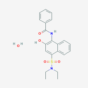 The synthesis of N-[4-(Diethylsulfamoyl)-2-hydroxynaphthalen-1-yl]benzamide hydrate involves several steps. One common method includes the reaction of 4-diethylsulfamoyl-2-hydroxynaphthalene with benzoyl chloride in the presence of a base such as pyridine. The reaction is typically carried out under reflux conditions to ensure complete conversion of the starting materials to the desired product. The resulting compound is then purified through recrystallization to obtain the hydrate form .