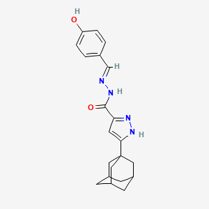 The compound (E)-3-((1S,3s)-adamantan-1-yl)-N'-(4-hydroxybenzylidene)-1H-pyrazole-5-carbohydrazide (CAS: 1285537-52-1) is a pyrazole-based carbohydrazide derivative featuring a rigid adamantane core and a 4-hydroxybenzylidene substituent. The adamantane moiety, a tricyclic hydrocarbon with high lipophilicity and steric bulk, enhances membrane permeability and metabolic stability, making it a common pharmacophore in antiviral and antimicrobial agents . The E-configuration of the hydrazone bond (-CH=N-) is critical for its bioactivity, as this geometry optimizes interactions with biological targets like enzymes or receptors . The 4-hydroxyphenyl group contributes to hydrogen bonding and π-π stacking, which are essential for binding affinity .