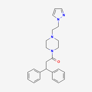 1-(4-(2-(1H-Pyrazol-1-yl)ethyl)piperazin-1-yl)-3,3-diphenylpropan-1-one is a piperazine-based compound featuring a central propan-1-one backbone substituted with two phenyl groups at the C3 position and a piperazine moiety at the C1 position. The piperazine ring is further modified with a 2-(1H-pyrazol-1-yl)ethyl chain. This structure combines aromatic (diphenyl), heterocyclic (pyrazole), and tertiary amine (piperazine) components, making it a candidate for diverse pharmacological applications, particularly in central nervous system (CNS) targeting or enzyme modulation .