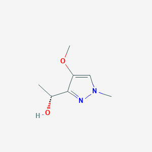 (1R)-1-(4-Methoxy-1-methylpyrazol-3-yl)ethanol is a chiral secondary alcohol with the molecular formula C₇H₁₂N₂O₂ and a molecular weight of 156.18 g/mol . The compound features a pyrazole ring substituted with methoxy and methyl groups at positions 4 and 1, respectively, coupled with an ethanol moiety at position 3. Key physicochemical parameters include: