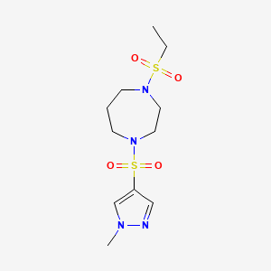 The synthesis of 1-(ethanesulfonyl)-4-[(1-methyl-1H-pyrazol-4-yl)sulfonyl]-1,4-diazepane typically involves multiple steps, starting from readily available precursors. One common synthetic route involves the reaction of 1-methyl-1H-pyrazole with ethylsulfonyl chloride under basic conditions to form the intermediate 1-(ethylsulfonyl)-1-methyl-1H-pyrazole. This intermediate is then reacted with 1,4-diazepane-4-sulfonyl chloride in the presence of a base to yield the final product.