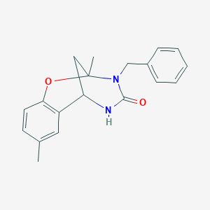 3-Benzyl-2,8-dimethyl-5,6-dihydro-2H-2,6-methanobenzo[g][1,3,5]oxadiazocin-4(3H)-one is a bicyclic heterocyclic compound featuring a fused benzo[g][1,3,5]oxadiazocine core. This structure incorporates a methano bridge (C-2 and C-6), a benzyl group at position 3, and methyl substituents at positions 2 and 6.