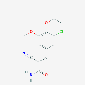 3-[3-Chloro-5-methoxy-4-(propan-2-yloxy)phenyl]-2-cyanoprop-2-enamide is a synthetic organic compound characterized by a substituted phenyl ring attached to a cyanoenamide backbone. Its structure includes a trifunctional aromatic system with chloro (at position 3), methoxy (position 5), and isopropoxy (position 4) substituents, along with a cyanopropenamide side chain. This compound is of interest in medicinal chemistry due to its structural similarity to kinase inhibitors and other bioactive molecules that target protein-protein interactions .