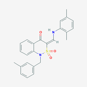 In biological and medical research, (3E)-3-{[(2,5-dimethylphenyl)amino]methylene}-1-(3-methylbenzyl)-1H-2,1-benzothiazin-4(3H)-one 2,2-dioxide is investigated for its potential therapeutic properties. It may exhibit antibacterial, antifungal, or anticancer activities, making it a candidate for drug development.